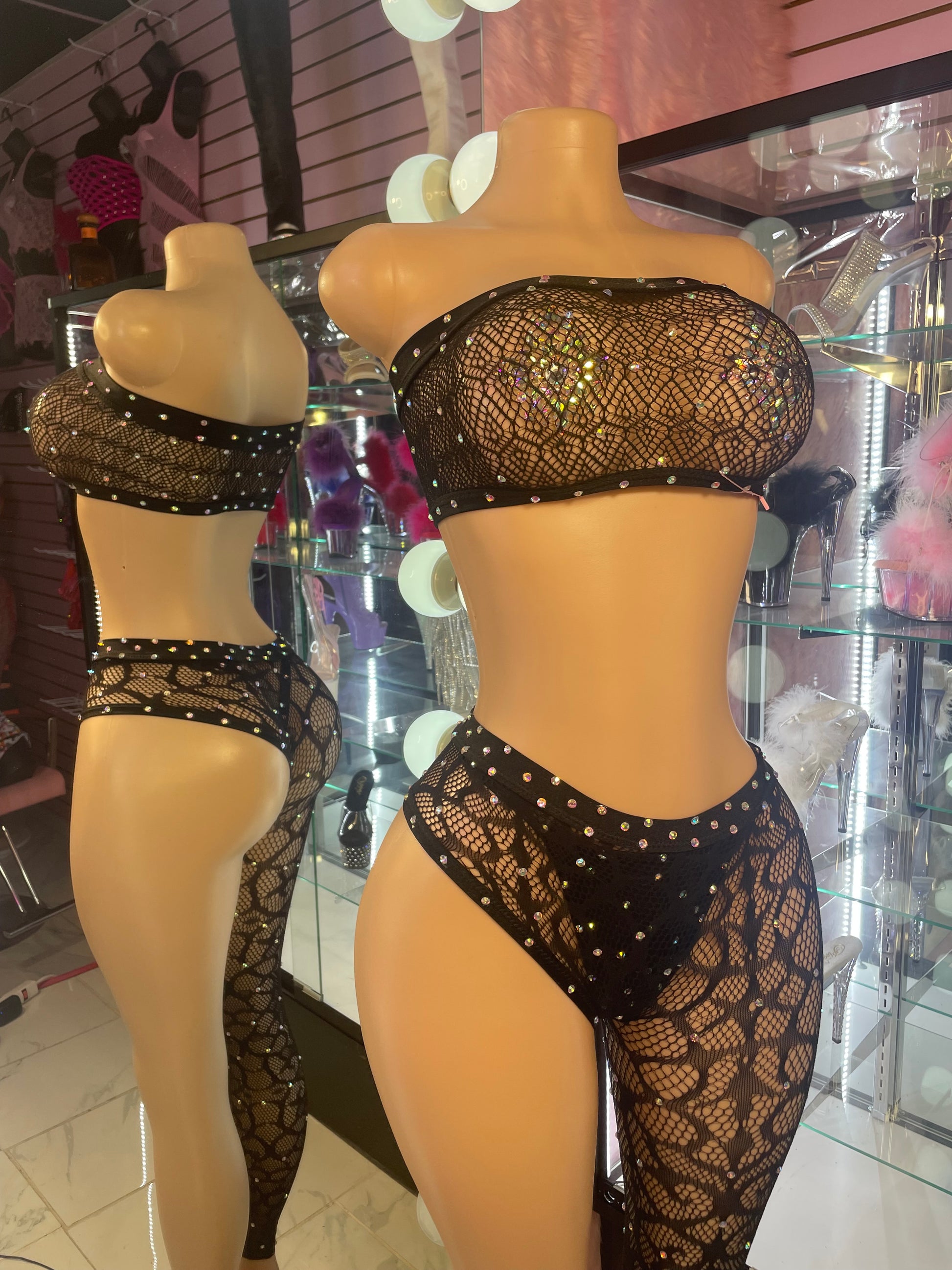 Atrévete a romper todas las reglas con nuestro Conjunto Bad Behavior. Este impactante conjunto de dos piezas incluye un top bandeau sin tirantes y una braguita de corte alto a juego, confeccionada en encaje de rejilla negro y adornada con pedrería para lograr el equilibrio perfecto entre vanguardia y glamour. Con su atrevido diseño asimétrico de piernas, este conjunto llama la atención desde cualquier ángulo. Perfecto para el escenario, la noche o cuando quieras dar rienda suelta a tu lado más salvaje.