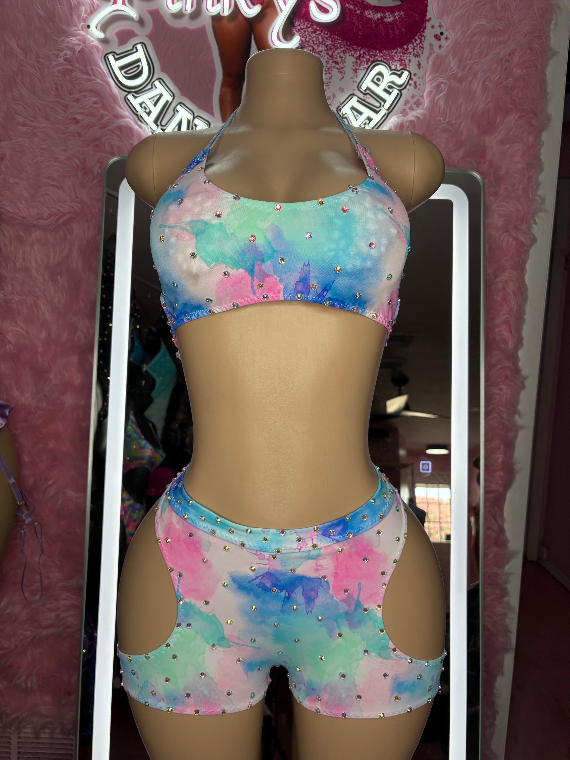 Dulce pero picante, el conjunto de dos piezas Bubble Gum Baby ofrece un toque divertido y atrevido. Este estampado pastel de acuarela está salpicado de tonos de ensueño en rosa, azul, verde y morado, con brillantes pedrería que le dan un toque especial. El top deportivo y chic combina a la perfección con los atrevidos shorts con aberturas para un look adorable y cautivador.