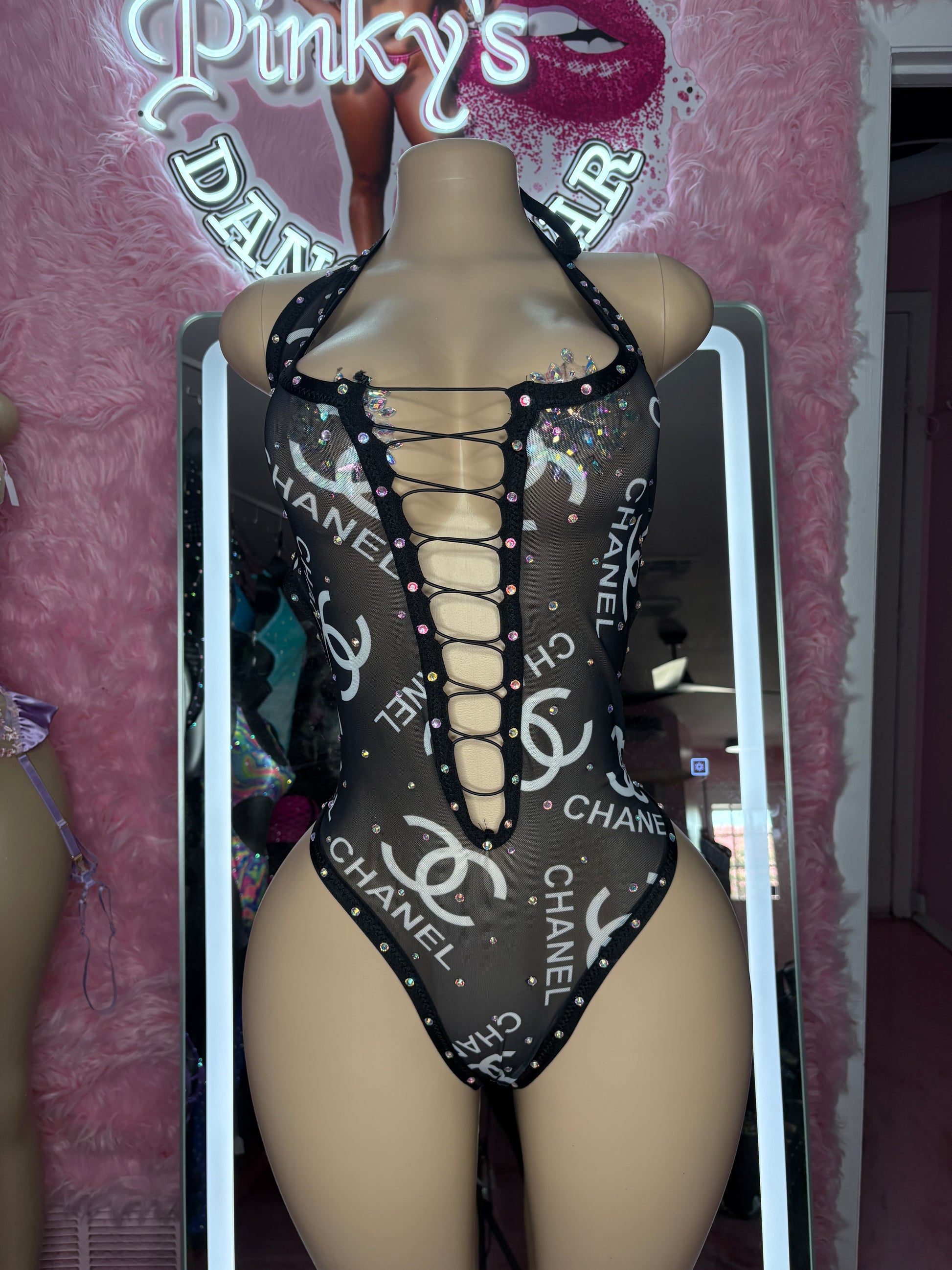 ¡El lujo se fusiona con la energía de una chica rebelde en el body Come CC Me ! Esta prenda de malla negra luce atrevidos logotipos de diseño, destellos de pedrería y un sensual corte con cordones en la parte delantera. Perfecto para acaparar todas las miradas y transmitir una sensación de líder a cada paso.