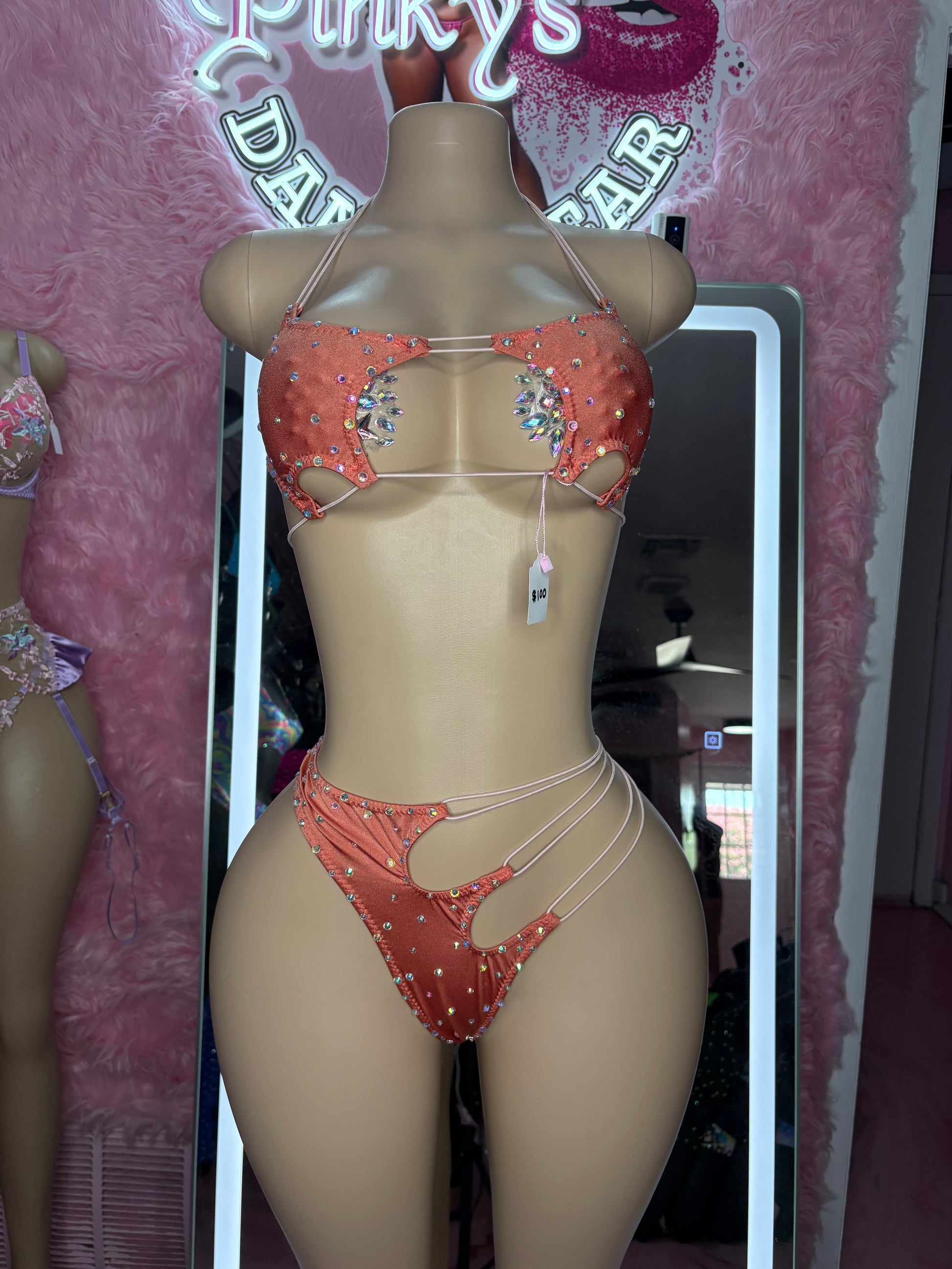 Brilla como la estrella que eres con el bikini Custom Star. Este conjunto único presenta un corte atrevido con brillantes pedrería sobre un lujoso acabado satinado. El top estilo halter tiene aberturas llamativas con detalles de gemas, mientras que la braguita asimétrica de tiras crea una silueta de alta costura. Perfecto para destacar en la piscina o en el escenario.