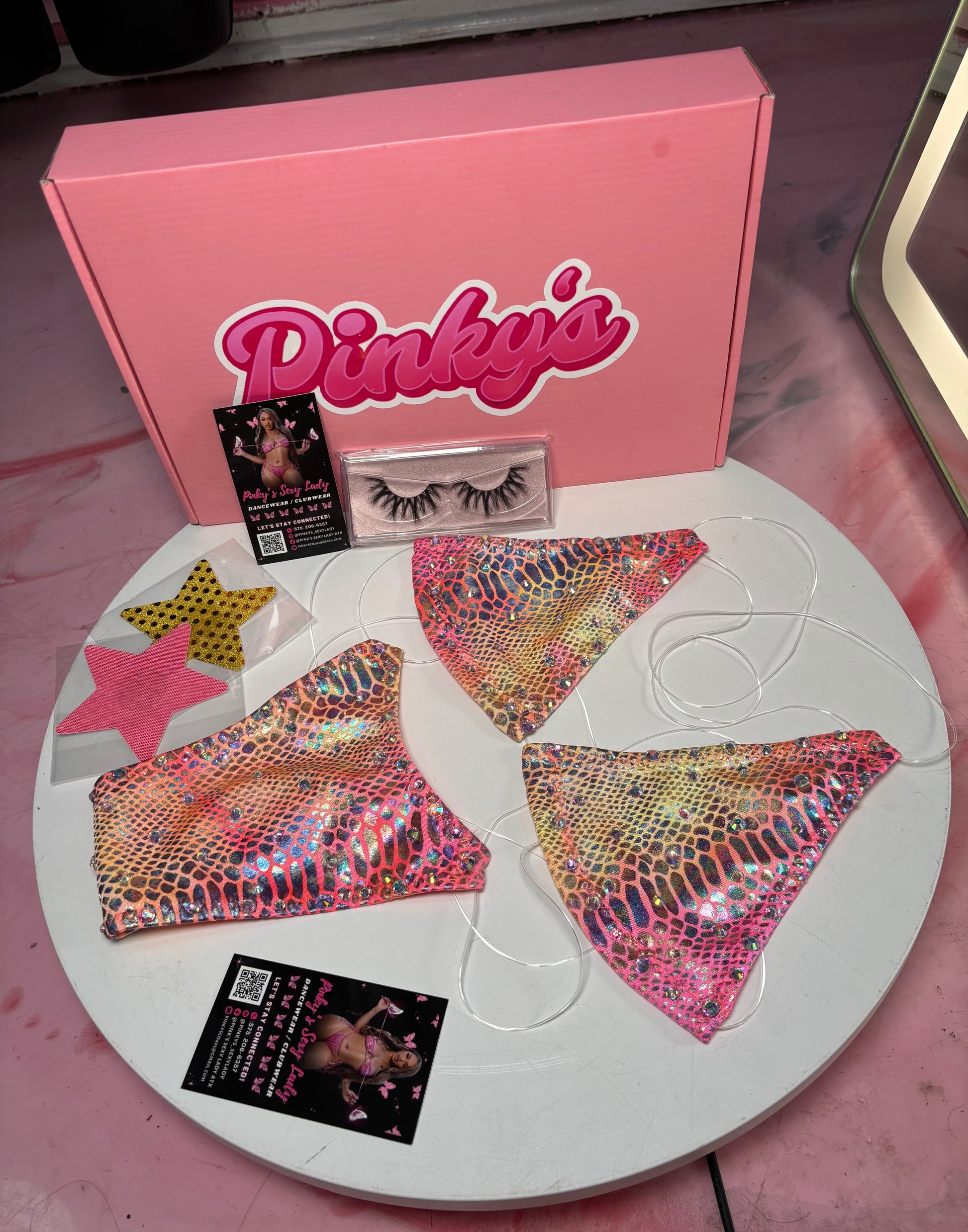Sube la temperatura con el microbikini Desert Mirage. Este exótico conjunto de dos piezas presenta un brillante estampado inspirado en la piel de serpiente en intensos tonos rosa, naranja y dorado, propios de un atardecer. Los brillantes detalles de pedrería capturan la luz como llamas del desierto, creando una ilusión sensual irresistible. Diseñado con un top triangular y una atrevida braguita micro, este conjunto encarna la seducción salvaje e indomable.