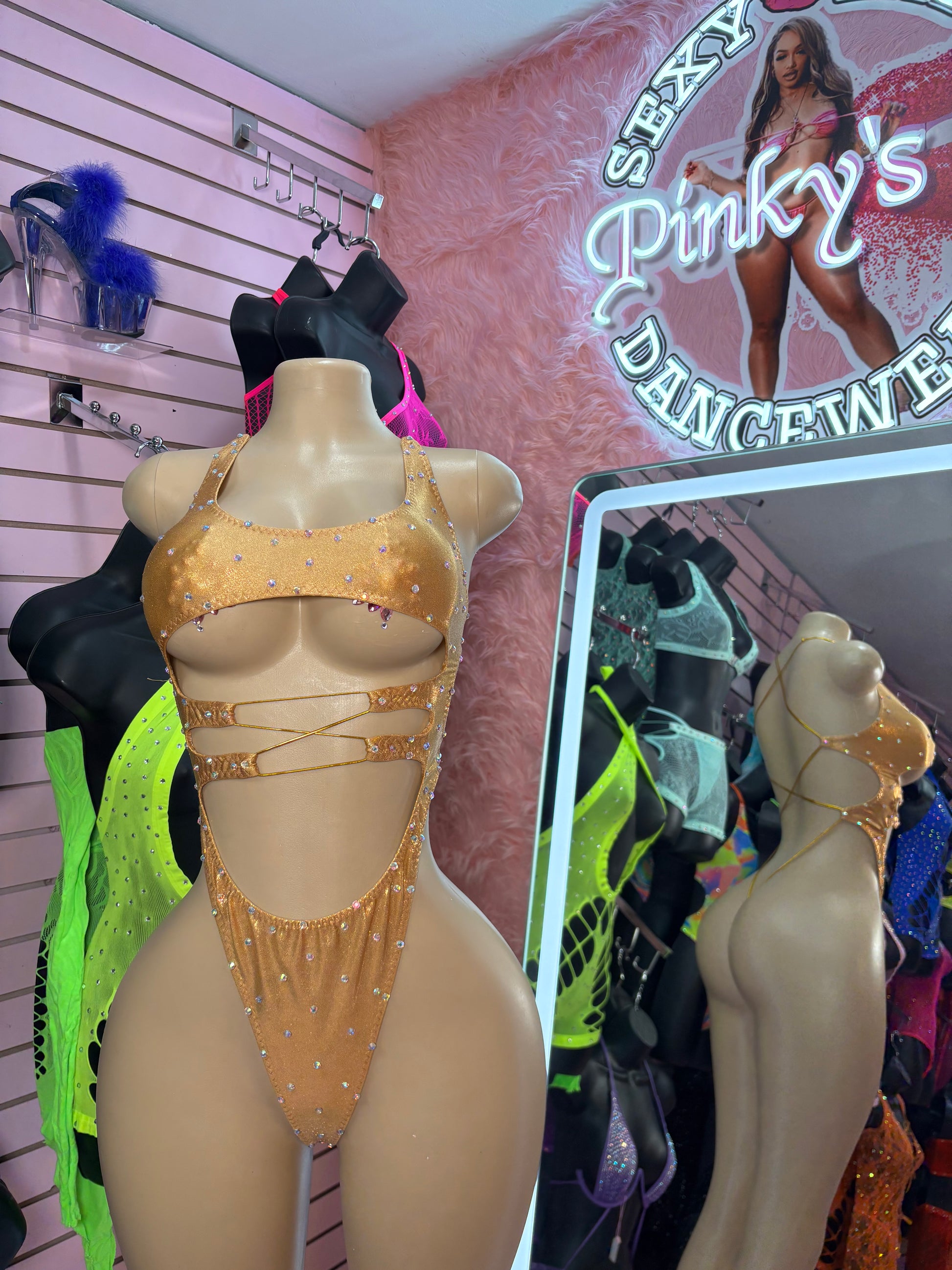 Brilla con más intensidad que las luces con nuestro conjunto de terciopelo Goldie Box. Este lujoso conjunto de dos piezas incluye un top bandeau de terciopelo brillante y una braguita de tanga de corte alto a juego que alarga tus piernas y se adapta a tus curvas. Su intenso tono dorado está diseñado para captar todas las miradas, brindándote un aspecto radiante y divino, ya sea en el escenario, actuando o creando ambiente. El terciopelo suave y elástico se siente tan bien como se ve: elegante, sensual e inolvidable.