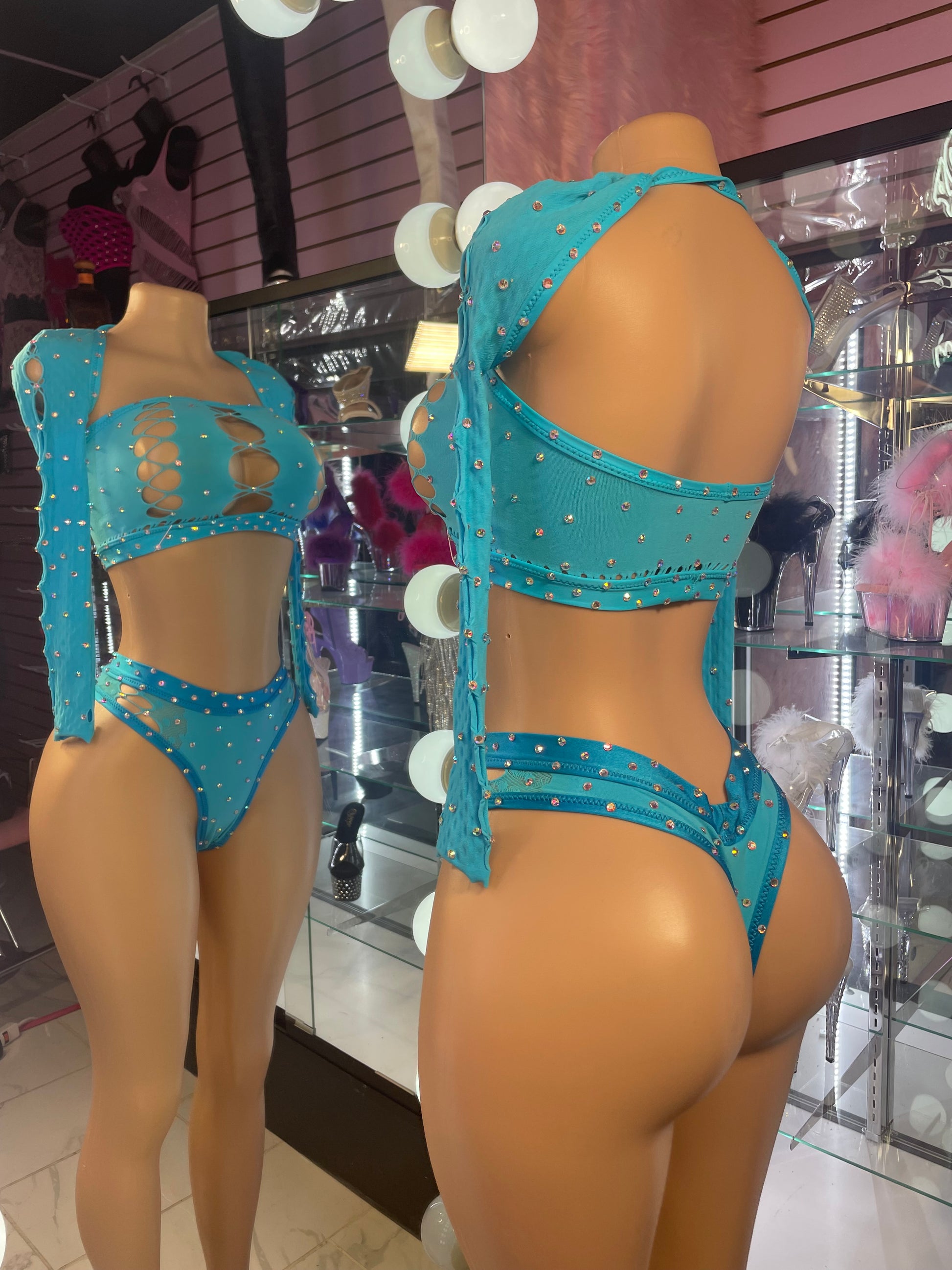Congela el protagonismo con nuestro conjunto Iced Out Queen. Este brillante conjunto de dos piezas incluye un top corto con aberturas atrevidas, mangas largas y brillantes detalles de pedrería, combinado con una braguita de cintura alta a juego que brilla desde cualquier ángulo. La vibrante tela azul hielo resalta bajo las luces, mientras que los detalles de tiras con aberturas le dan la combinación perfecta de atrevimiento y sensualidad. Confeccionado con material elástico y transpirable, este conjunto se adapta a tus curvas y te hace brillar como la realeza toda la noche.