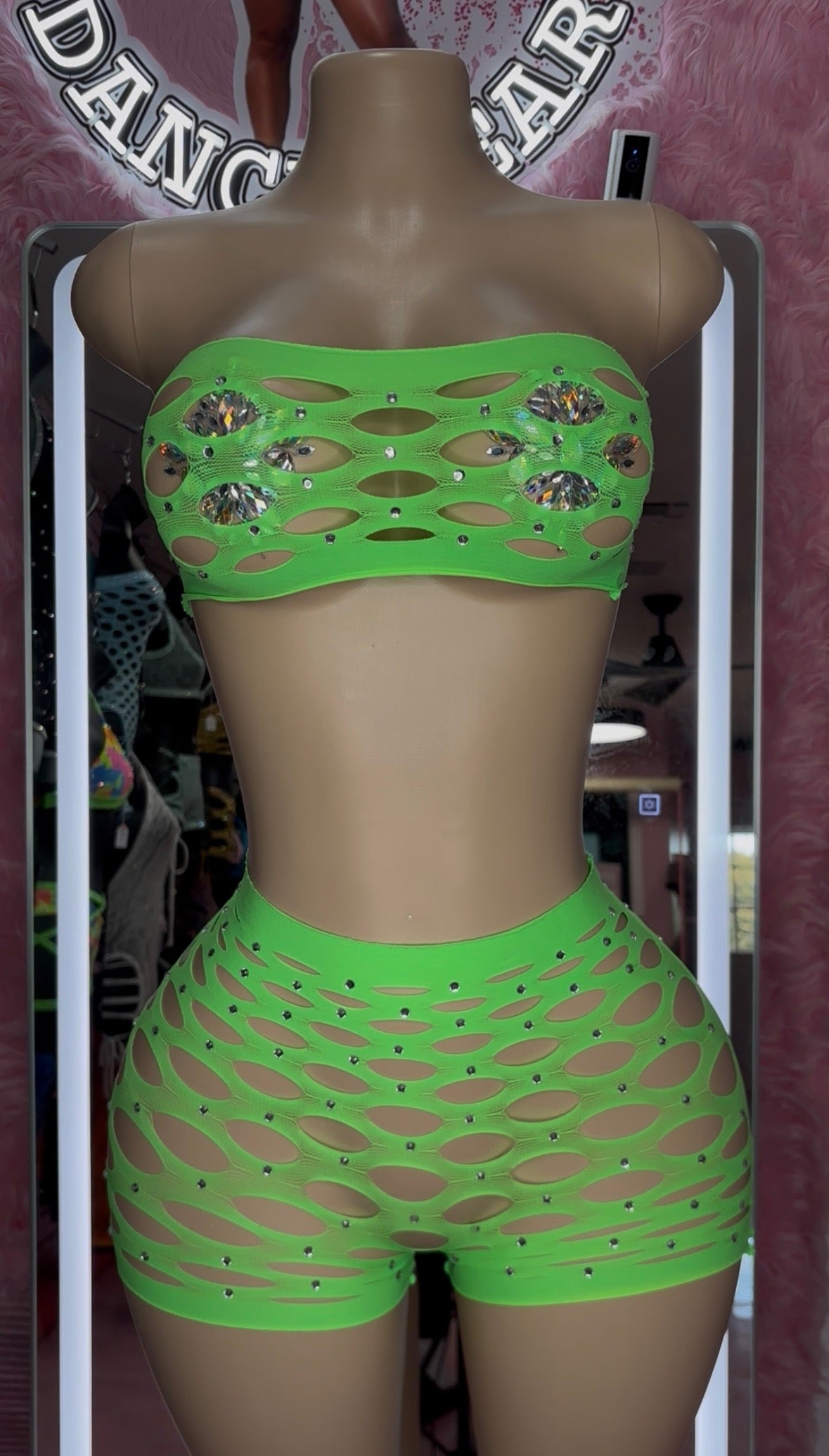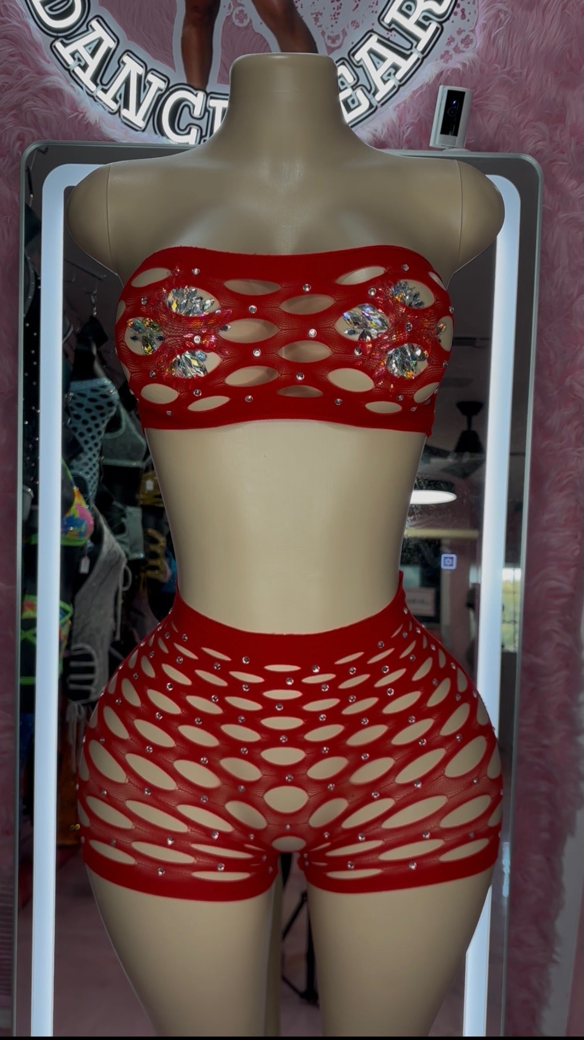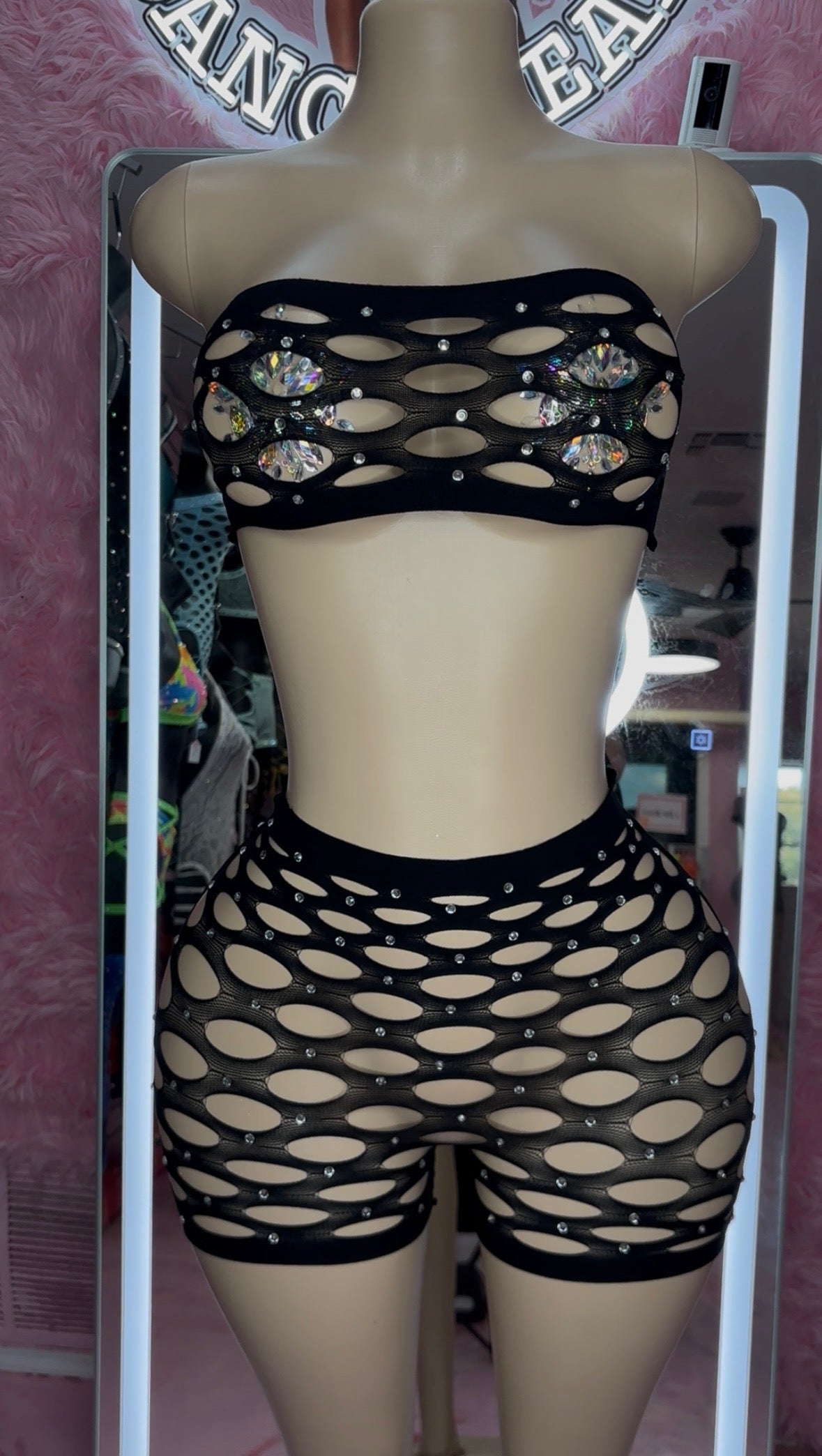 Oscuro, atrevido y lleno de confianza, el conjunto Love Me Not de dos piezas está hecho para romper corazones. Con un sensual bandeau negro y shorts con cortes ovalados, este conjunto está adornado con brillantes diamantes de imitación y apliques de cristal extragrandes para un acabado deslumbrante. A la vez feroz y glamuroso, es un look que acapara todas las miradas.