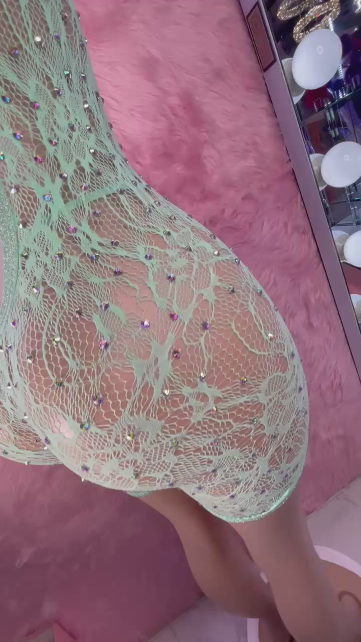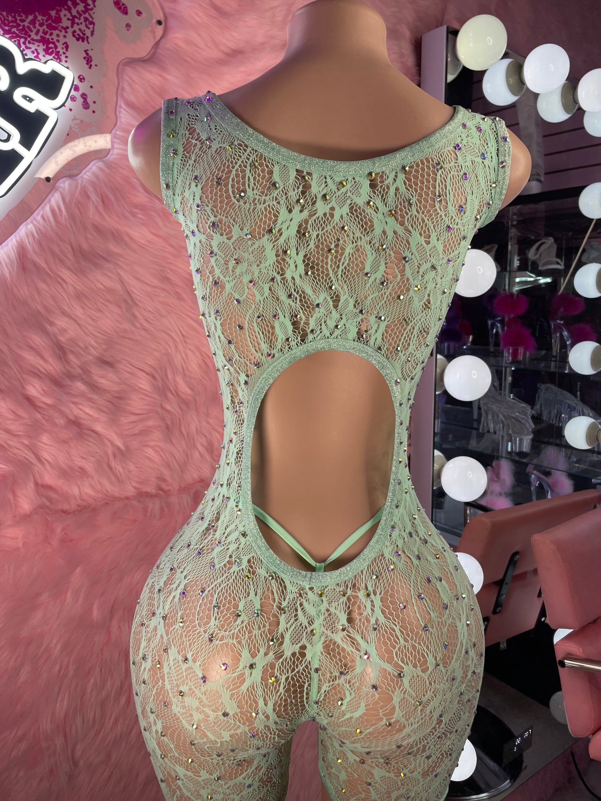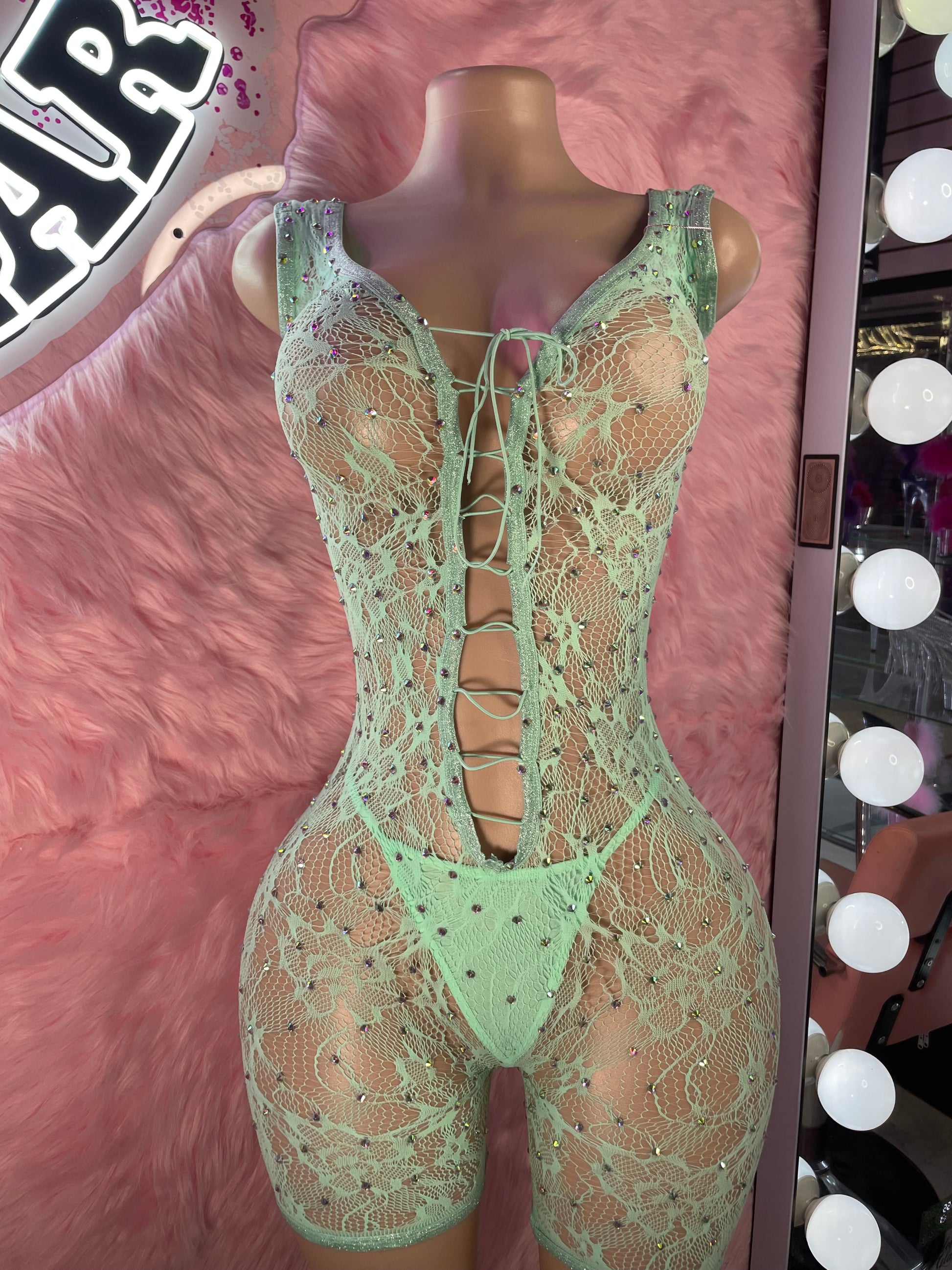 Suave, dulce, pero peligrosamente inolvidable. El mono Ms. Tiffany deslumbra con su encaje verde menta, destellos de pedrería y un escote pronunciado con cordones que se adapta a cada curva. Perfecto para una entrada inolvidable.