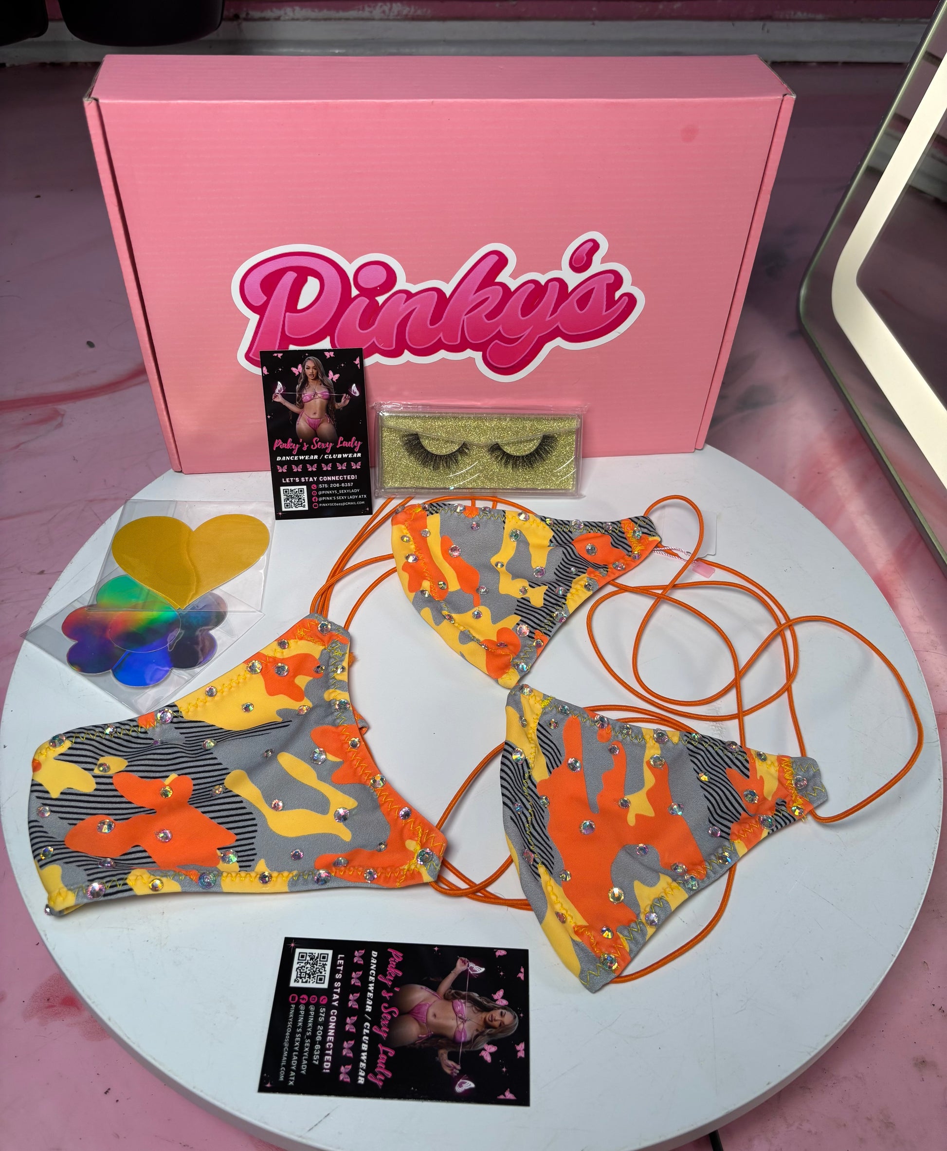 Destaca y camufla con el Microbikini Camuflaje Naranja. Este atrevido conjunto de dos piezas reinventa el camuflaje con llamativos tonos naranja, amarillo y gris, acentuados con brillantes pedrería para un toque atrevido. El top triangular y la microbraguita aportan una energía audaz, mientras que los tirantes naranja brillante añaden un toque extra que llama la atención.