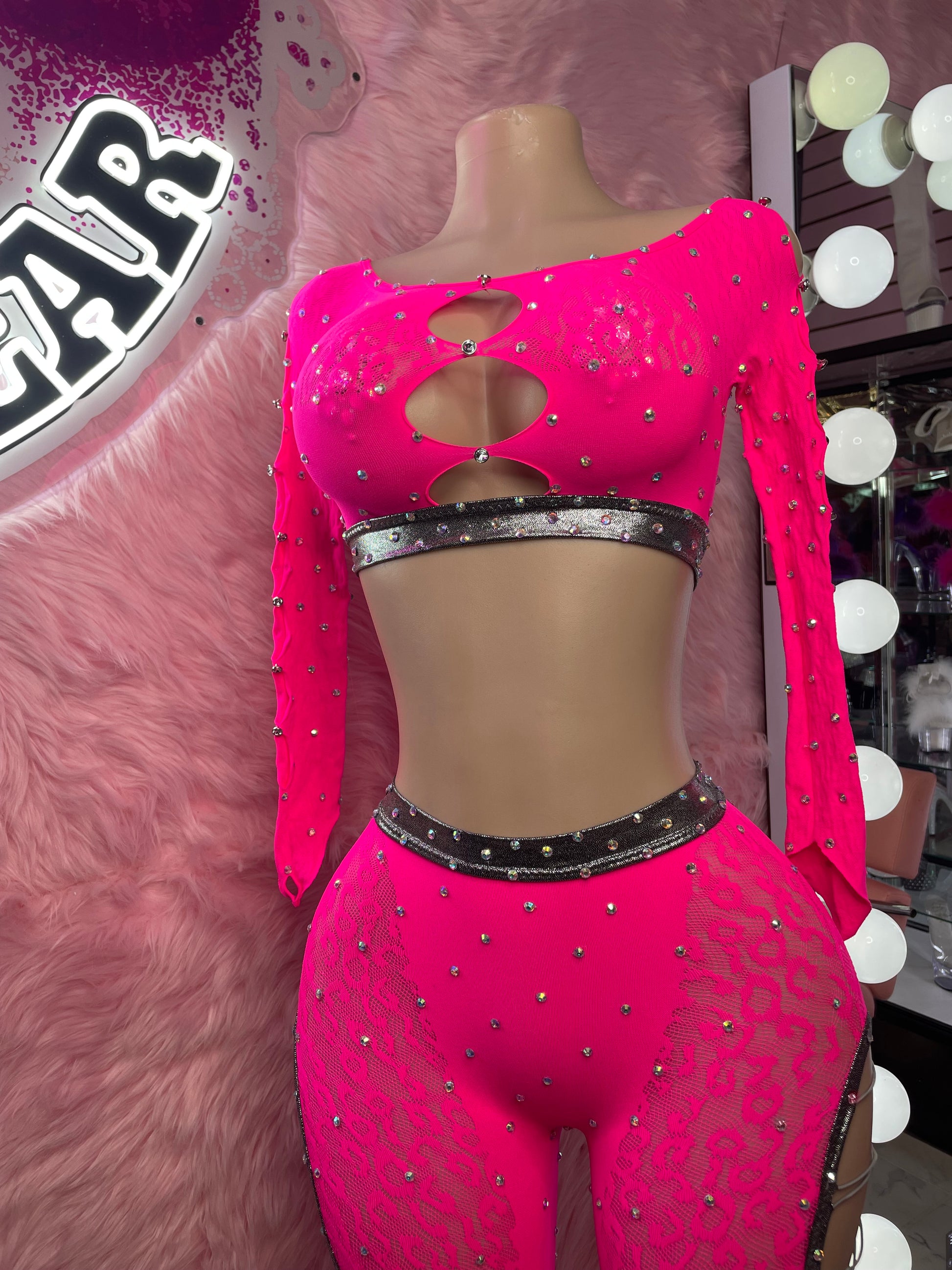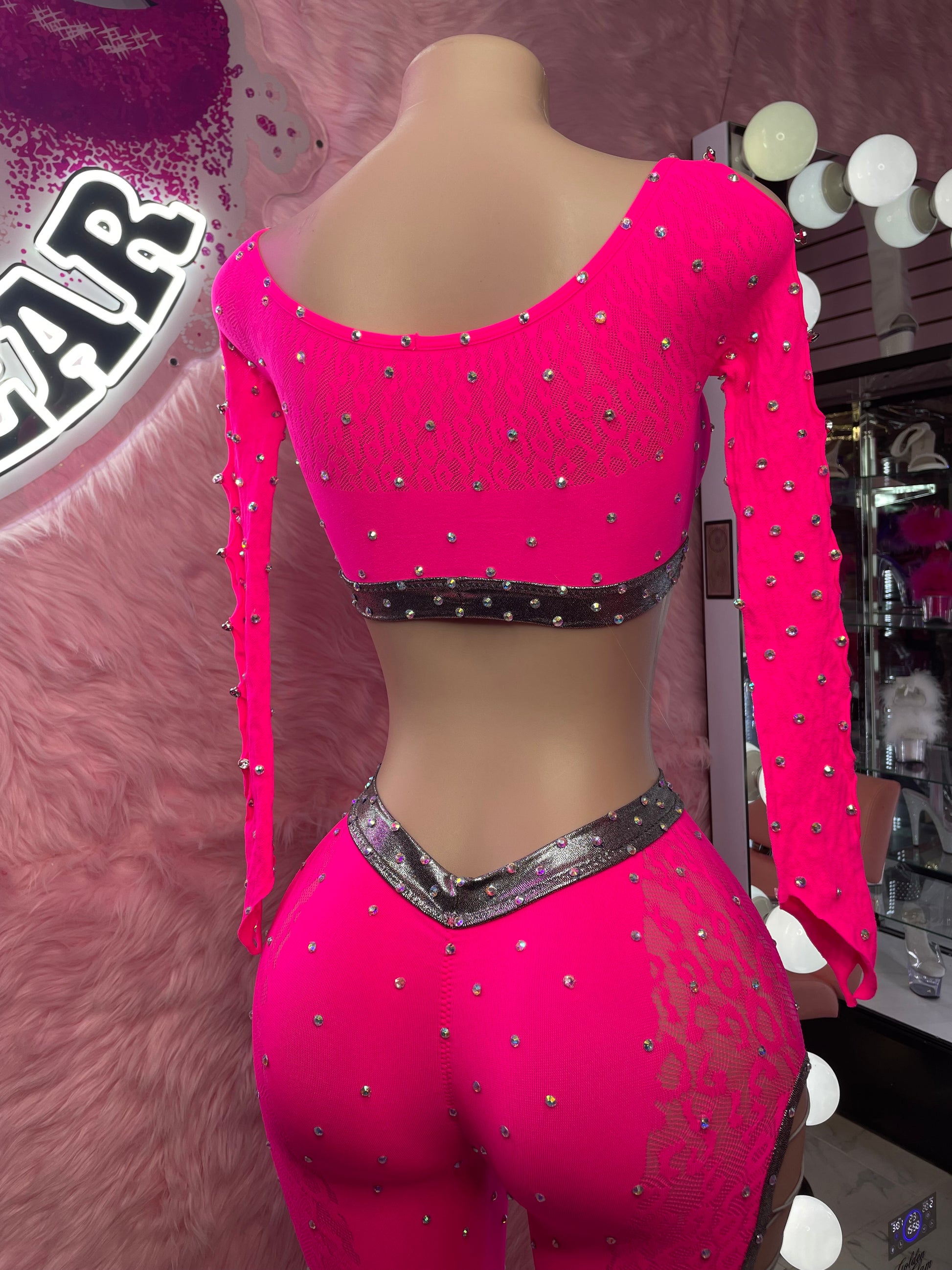 Acapara todas las miradas con el conjunto Pink Friday: un conjunto de dos piezas en rosa intenso que te dará un aire glamuroso, atrevido e inolvidable. El top corto de manga larga con pedrería presenta detalles de triple abertura para una mayor provocación, mientras que los pantalones a juego de cintura alta están rematados con ribetes brillantes y paneles de encaje transparente para una combinación perfecta de sensualidad y elegancia.