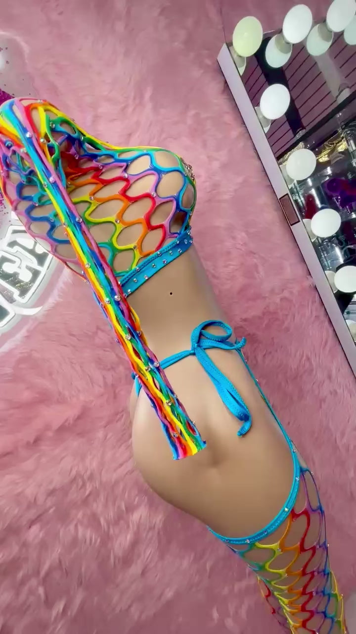 Sumérgete en el color con el Conjunto Charcos Arcoíris: un look atrevido y divertido que es imposible de ignorar. Con un top corto de rejilla arcoíris de manga larga y pantalones a juego con detalles de pedrería y lazos laterales, este conjunto es pura diversión, confianza y para convertir la fiesta en tu pasarela.