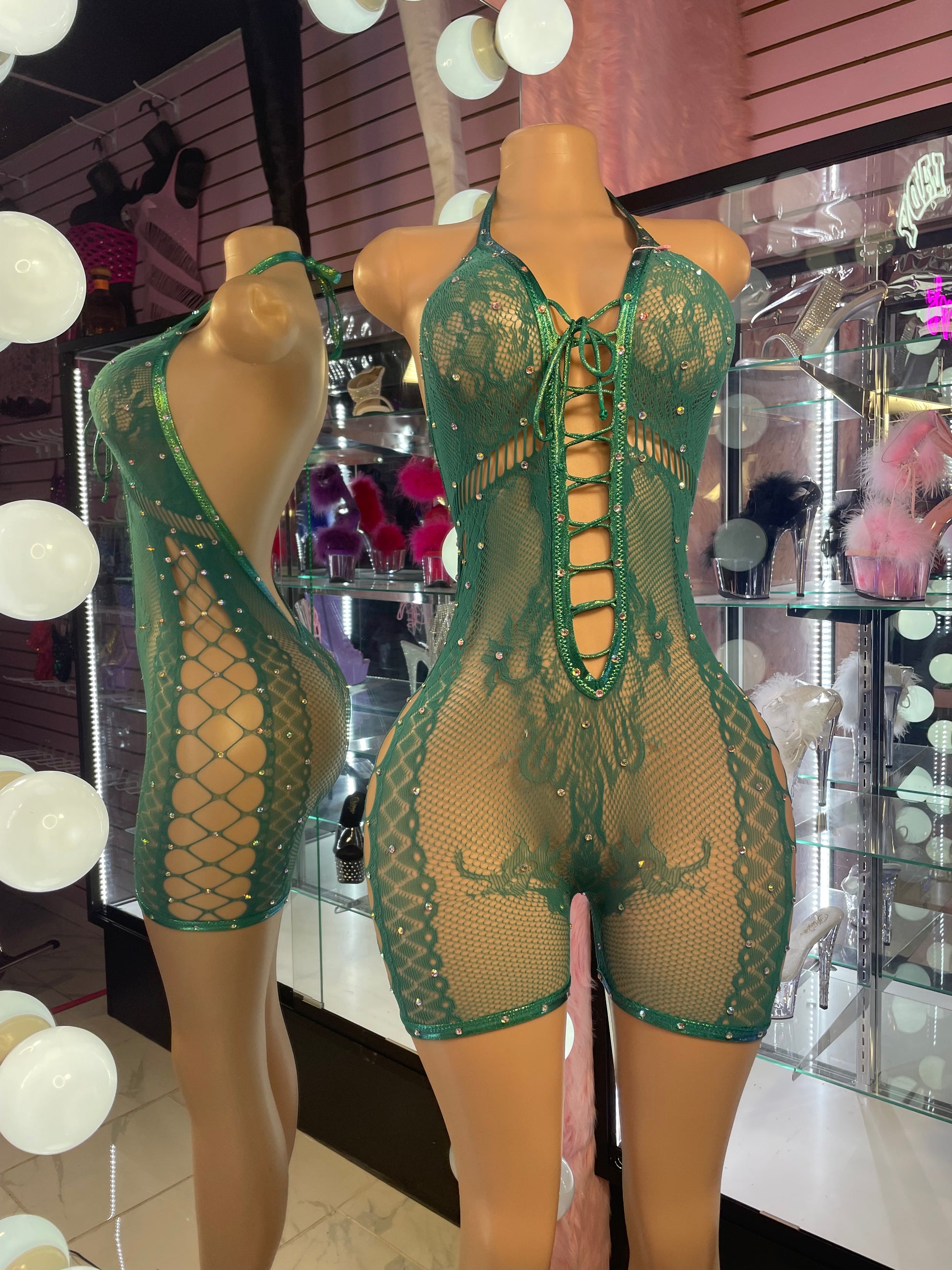 Infunde respeto con nuestro mono Rich & Ruthless. Este mono verde esmeralda intenso presenta un escote halter con cordones y destellos de pedrería, además de atrevidos cortes laterales para una combinación perfecta de elegancia y atrevimiento. El diseño de red y encaje que se adapta a las curvas se adapta a tu figura, mientras que los detalles brillantes brillan bajo cualquier luz. Perfecto para bailarinas, artistas o cualquiera que busque potencia y confianza en cada movimiento.