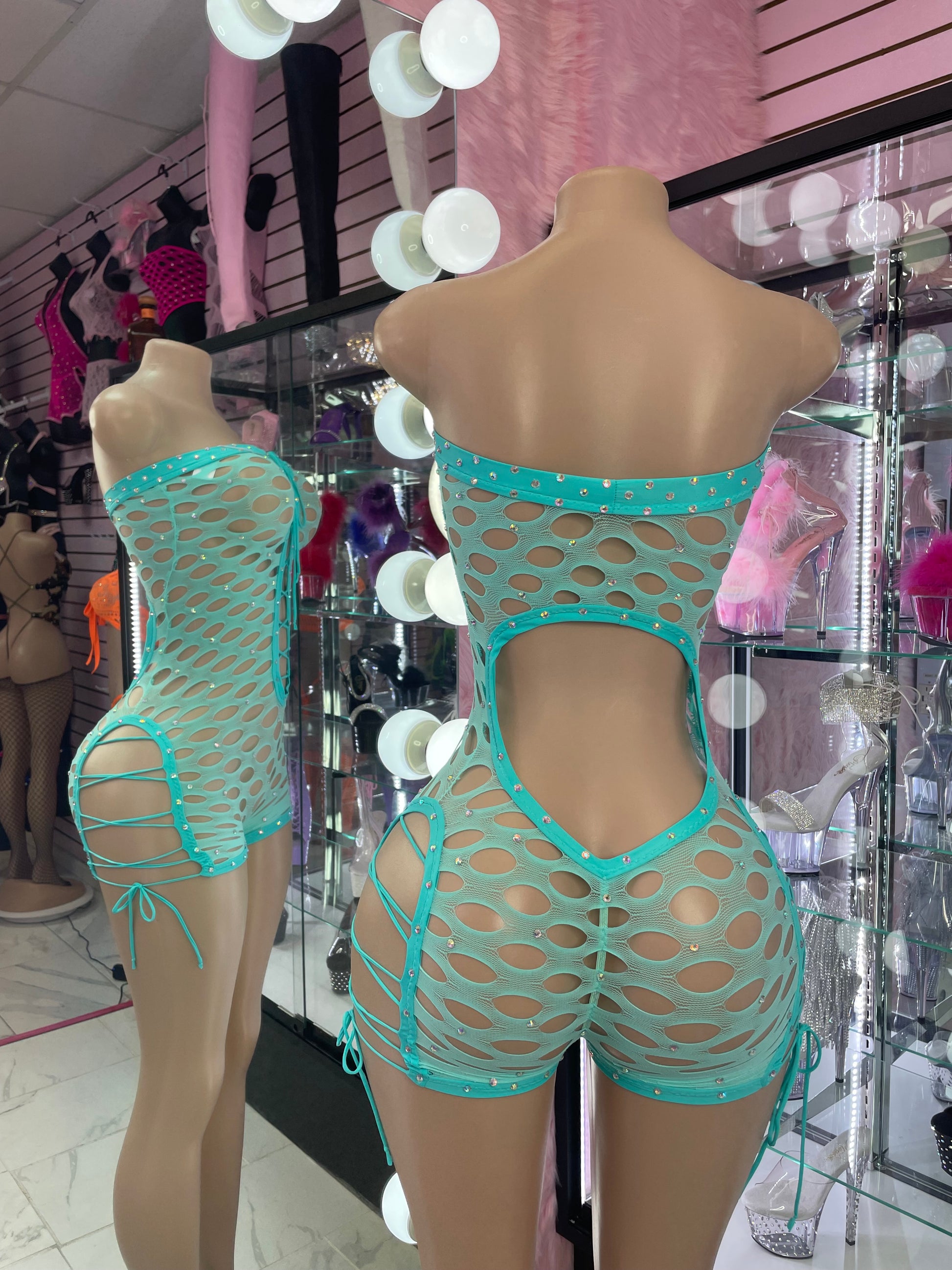Convierte el misterio en seducción con el mono Secret Circle. Esta atrevida prenda azul agua presenta atrevidos cortes circulares, brillantes detalles de pedrería y cordones que estilizan tus curvas en los puntos perfectos. Con su corte atrevido y su diseño vanguardista, este mono está hecho para ser el centro de atención.