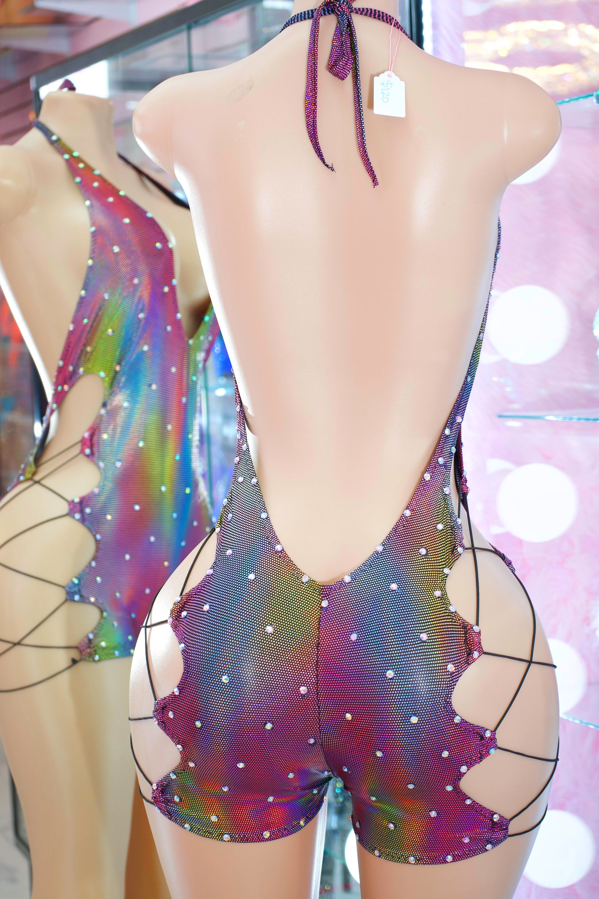 Prueba el arcoíris, literalmente. El conjunto Skittles es un bañador atrevido y multicolor que se adapta a cada curva y te aporta calor con cada movimiento. Con un escote profundo, cristales de imitación y sensuales aberturas laterales con cordones, esta pieza fue hecha para ser el centro de atención.