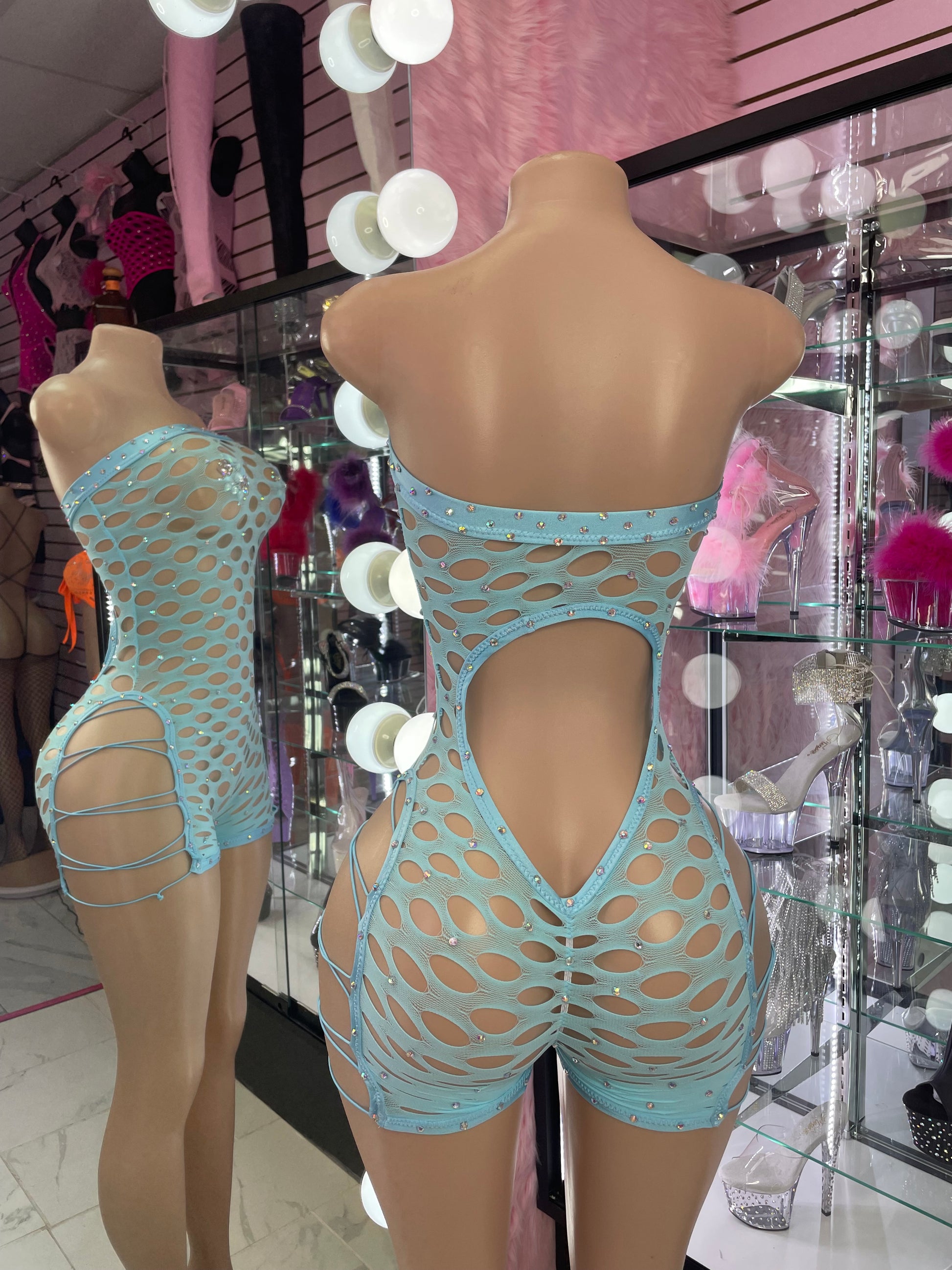 Sumérgete en la tentación con el mono Sky Baby. Diseñado en un encantador tono azul cielo, este mono de una pieza se adapta a tus curvas con atrevidos cortes y detalles de cordones laterales que llaman la atención desde cualquier ángulo. La pedrería dispersa brilla con cada movimiento, lo que lo convierte en un mono tan coqueto como atrevido.