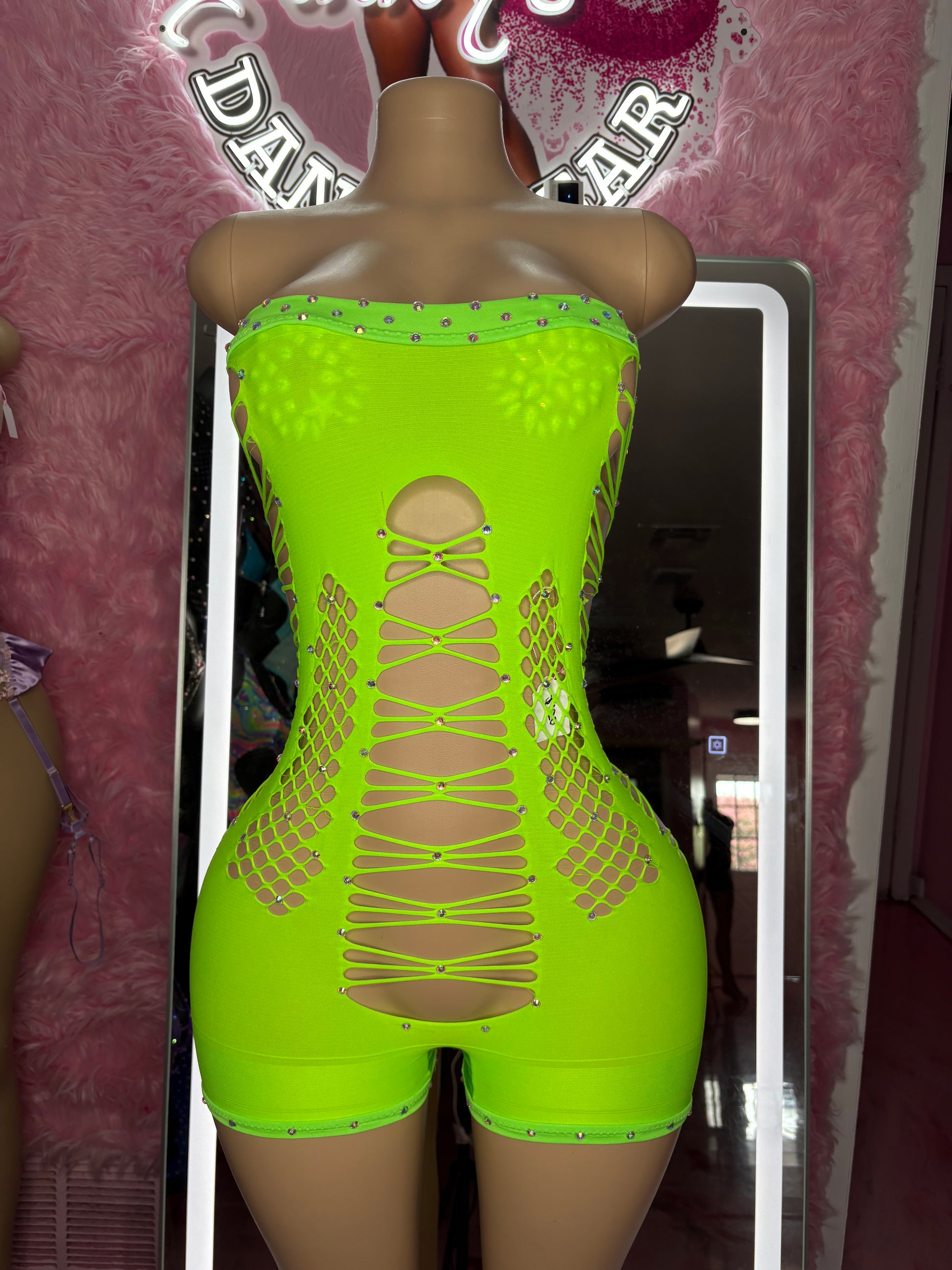 ¡Brilla con orgullo con el mono Slime! Este impactante mono verde neón se adapta a cada curva, mientras que su corte cruzado frontal y los laterales de rejilla le dan un toque atrevido y vanguardista. Los detalles de pedrería capturan la luz a la perfección, convirtiéndote en la estrella definitiva, ya sea en el escenario o en la fiesta.